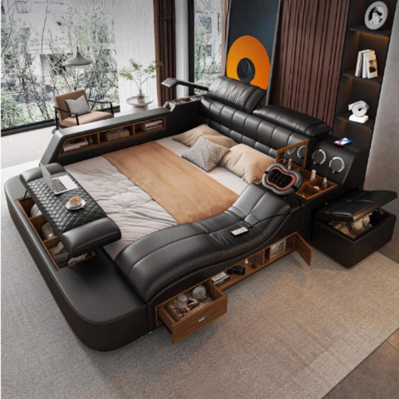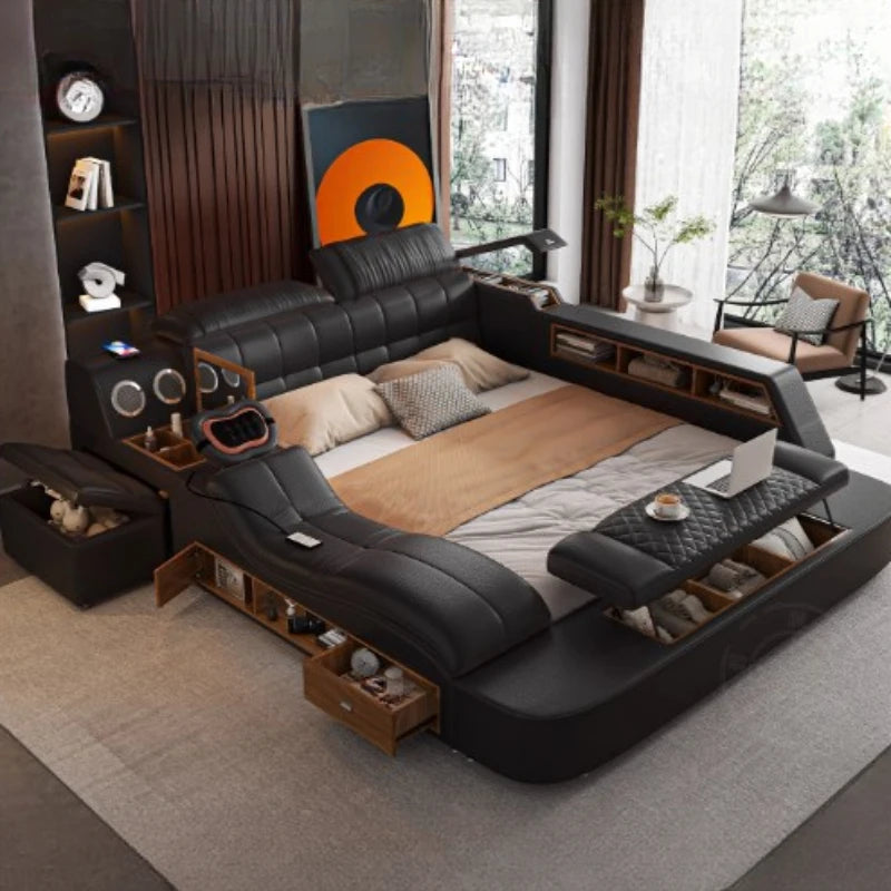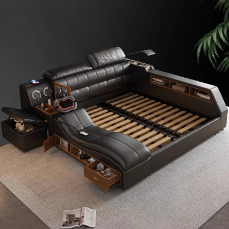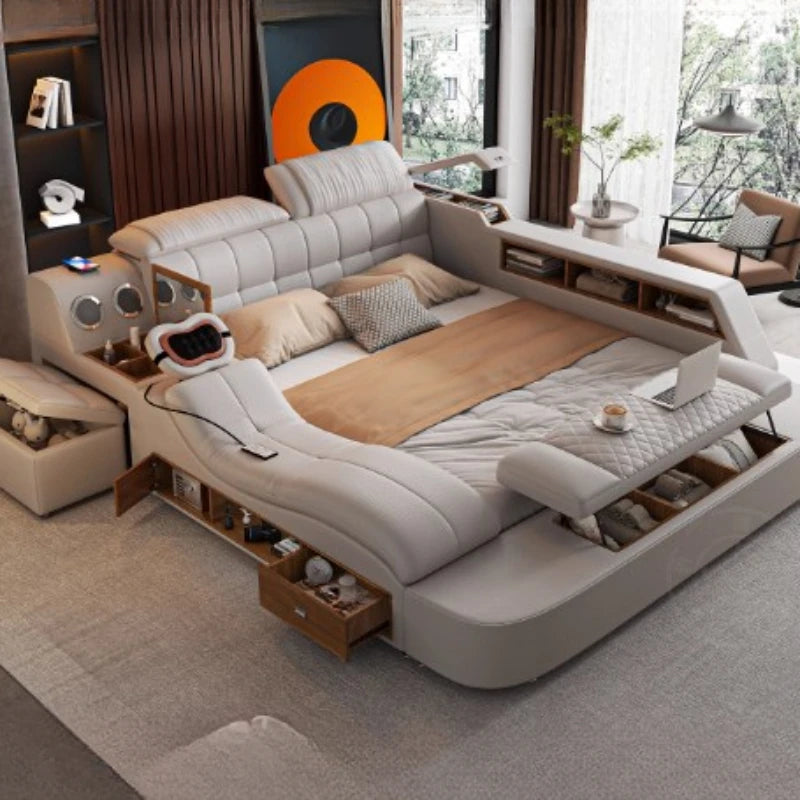 The bed’s luxurious wooden construction and modern aesthetics make it a standout piece in any bedroom. It’s designed to accommodate both queen and king-size mattresses, ensuring versatility and comfort. The multifunctional design provides convenient storage space, ideal for keeping bedding, clothing, or other essentials neatly tucked away.