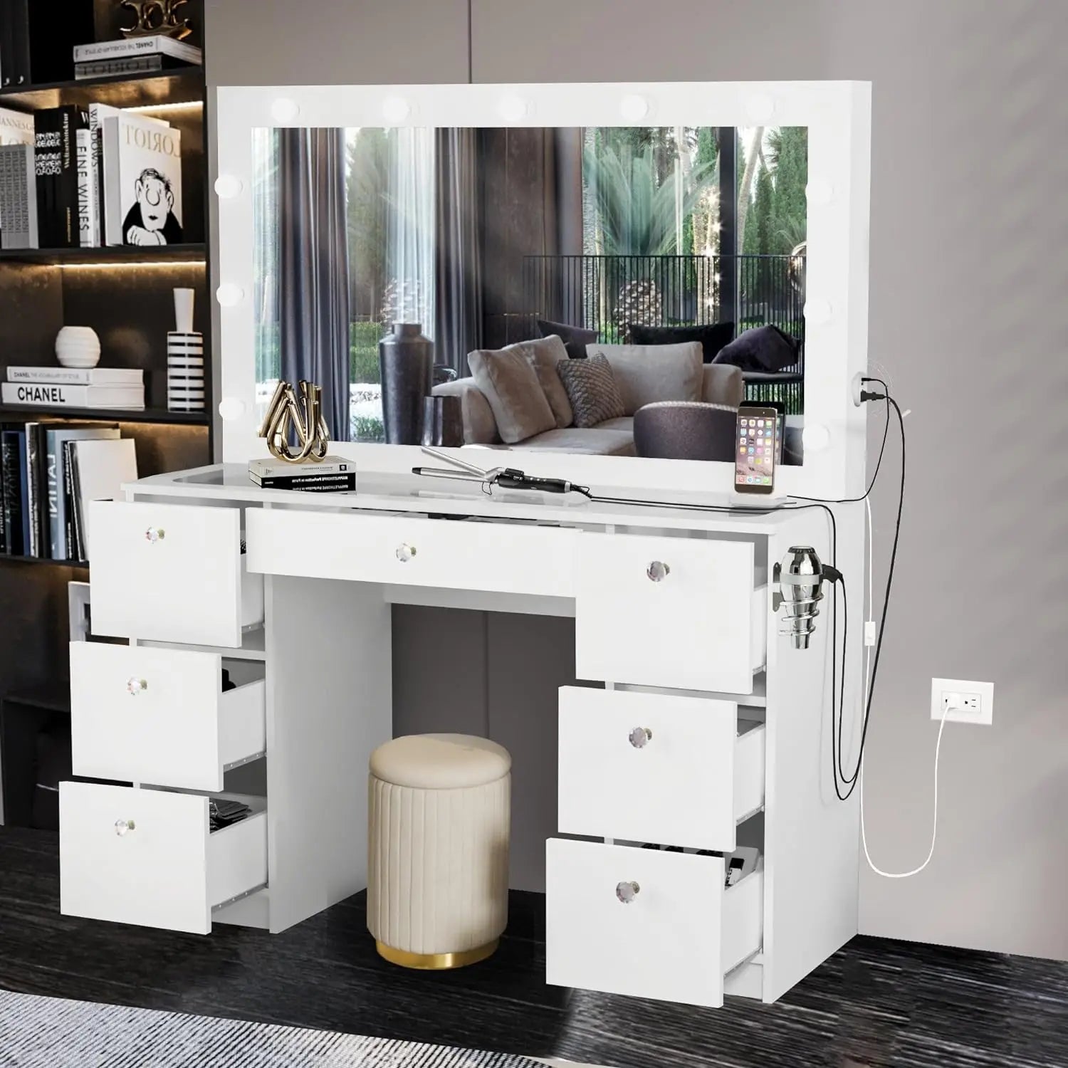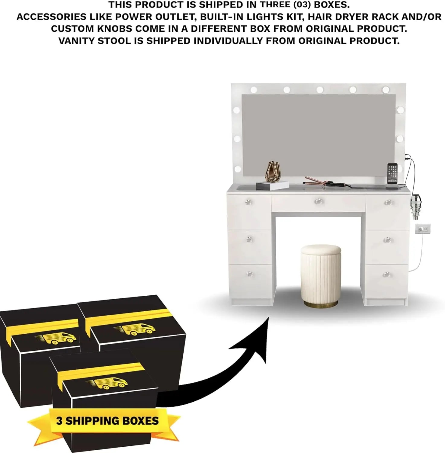 The vanity is equipped with seven spacious drawers, providing ample storage for all your beauty essentials, accessories, and personal items. The large mirror, complemented by the integrated lighting, ensures perfect visibility and a flawless finish. With its sleek white finish and modern design, this vanity set adds a touch of luxury to any bedroom or dressing room.