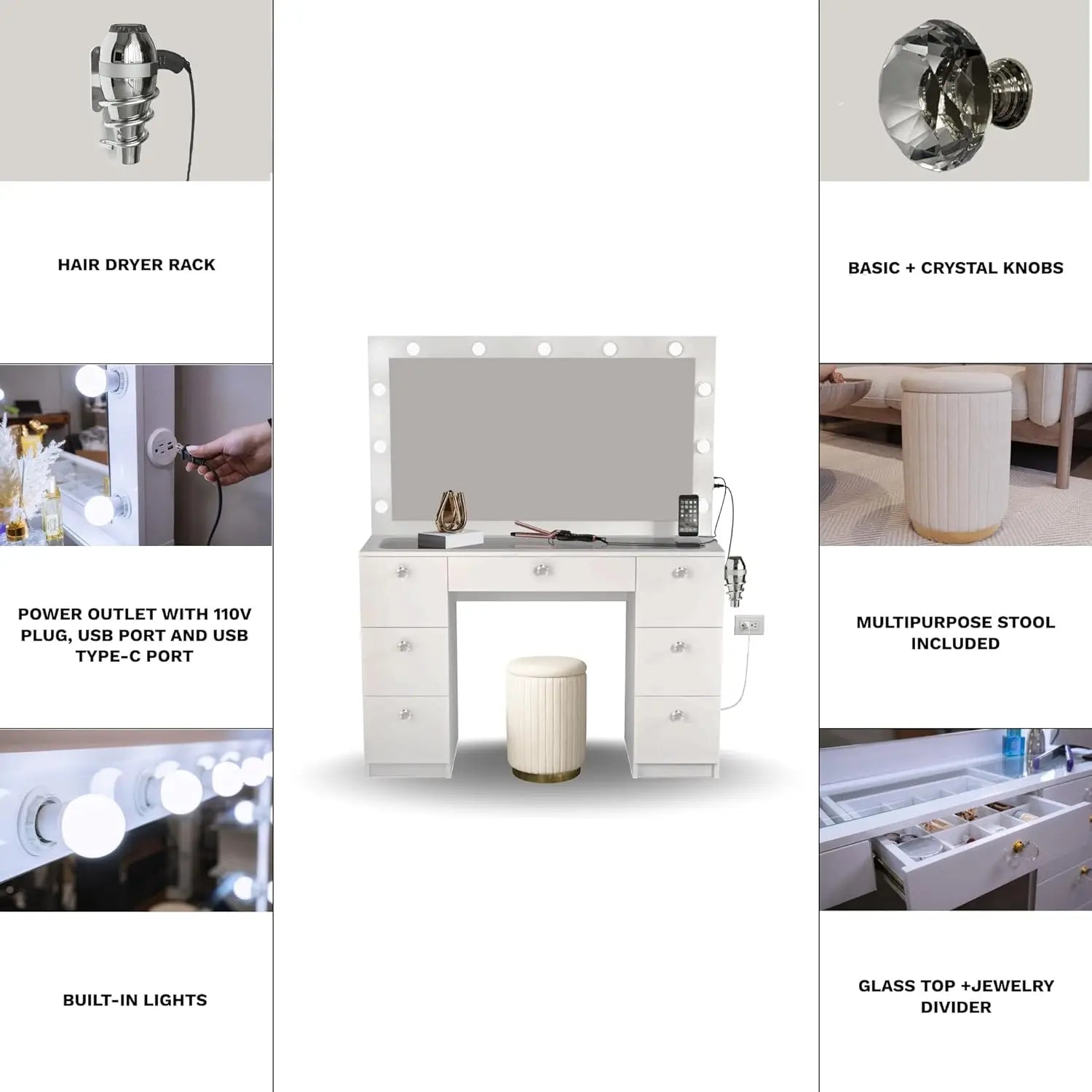 Boahaus Lyra Large Makeup Vanity Desk with Lights & Stool