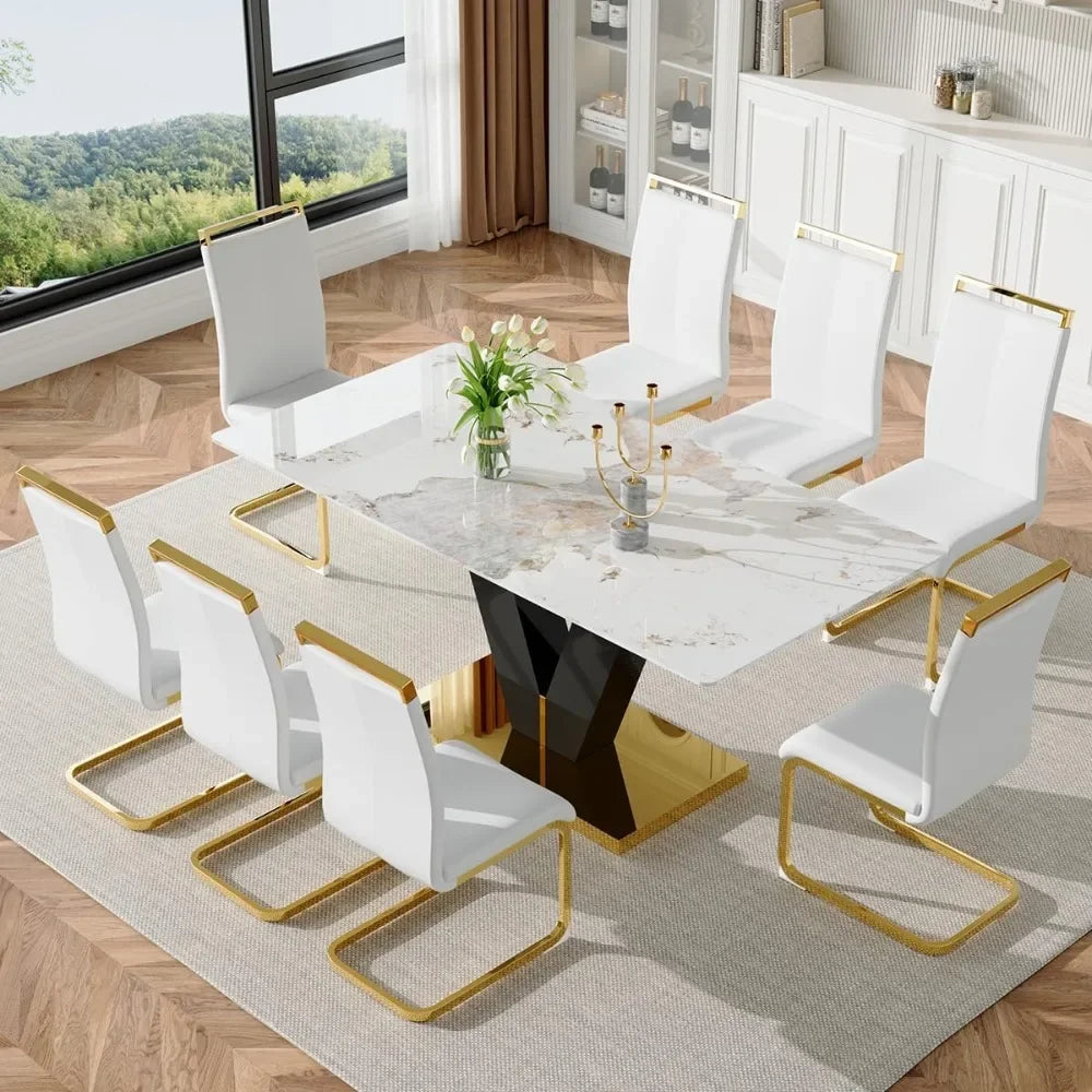 Marble Dining Table Set: 71-Inch Glass Table, 8 White PU Leather Chairs