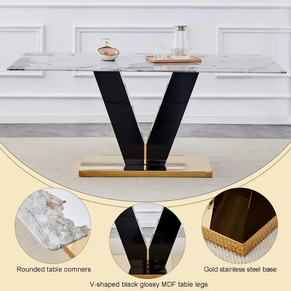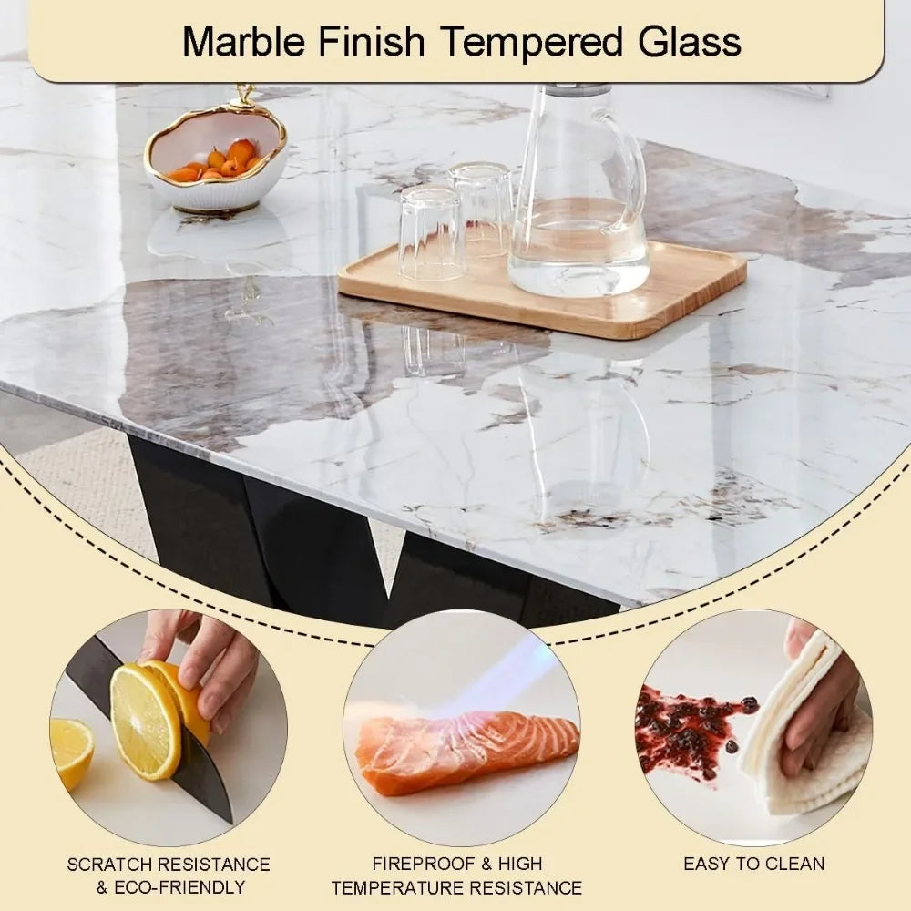 Striking Marble Design: The dining table boasts a stunning marble-patterned surface under a clear glass top, adding a luxurious and contemporary flair to your dining space. The marble design brings a sense of timeless elegance to the table.