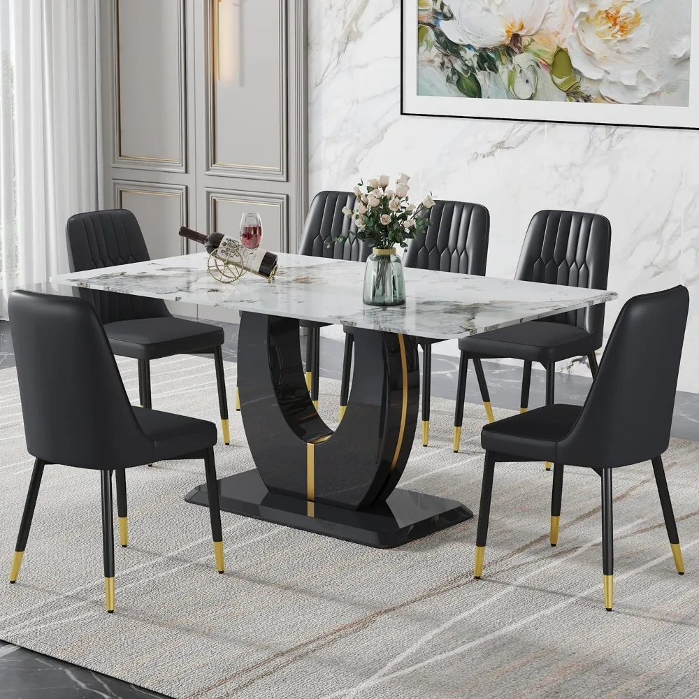 White Marble Dining Table Set for 6: Glass Top, Black PU Leather Upholstered Chairs