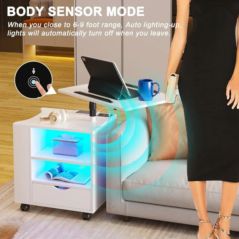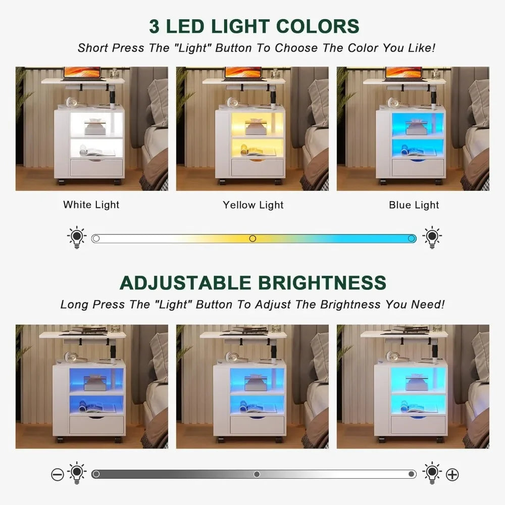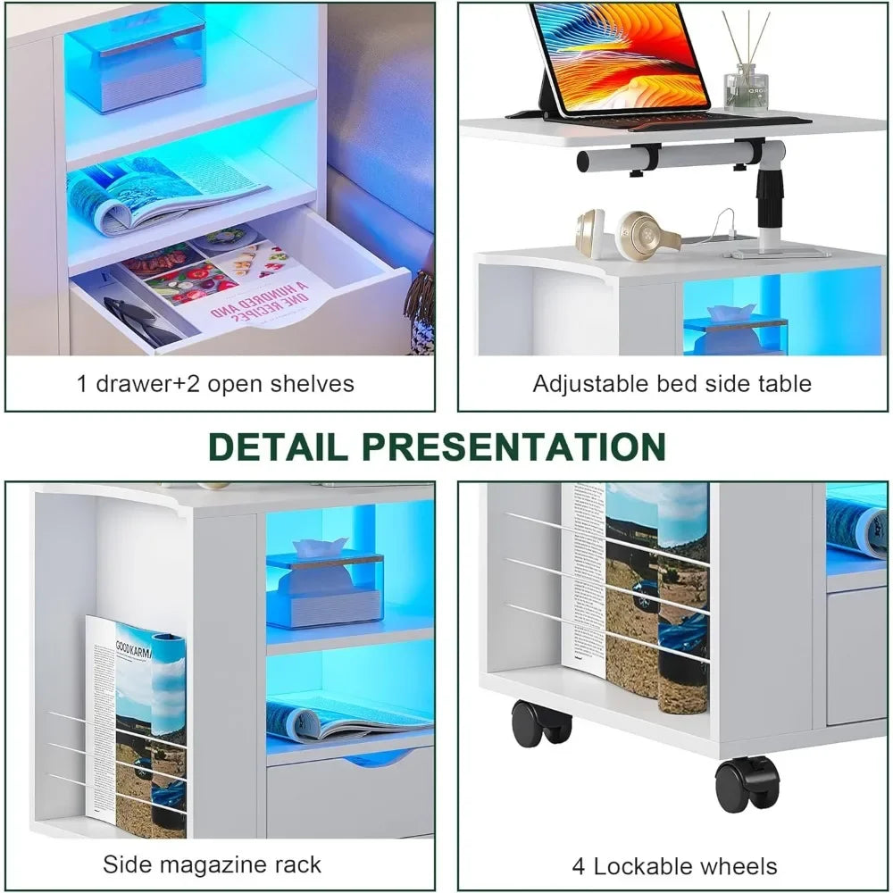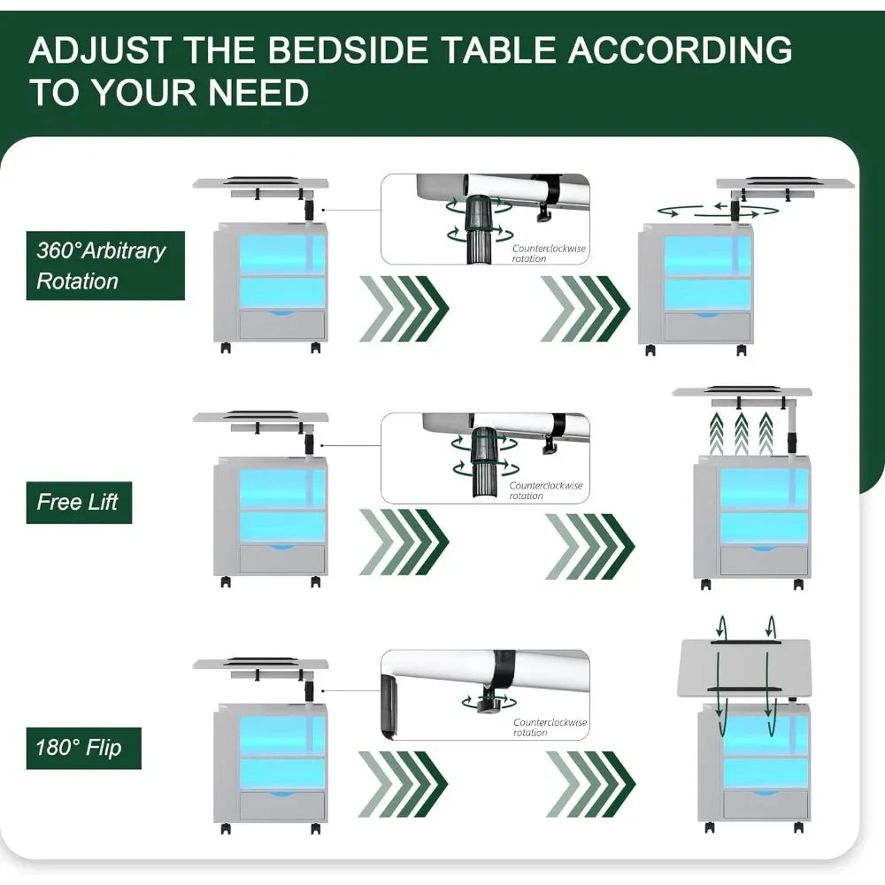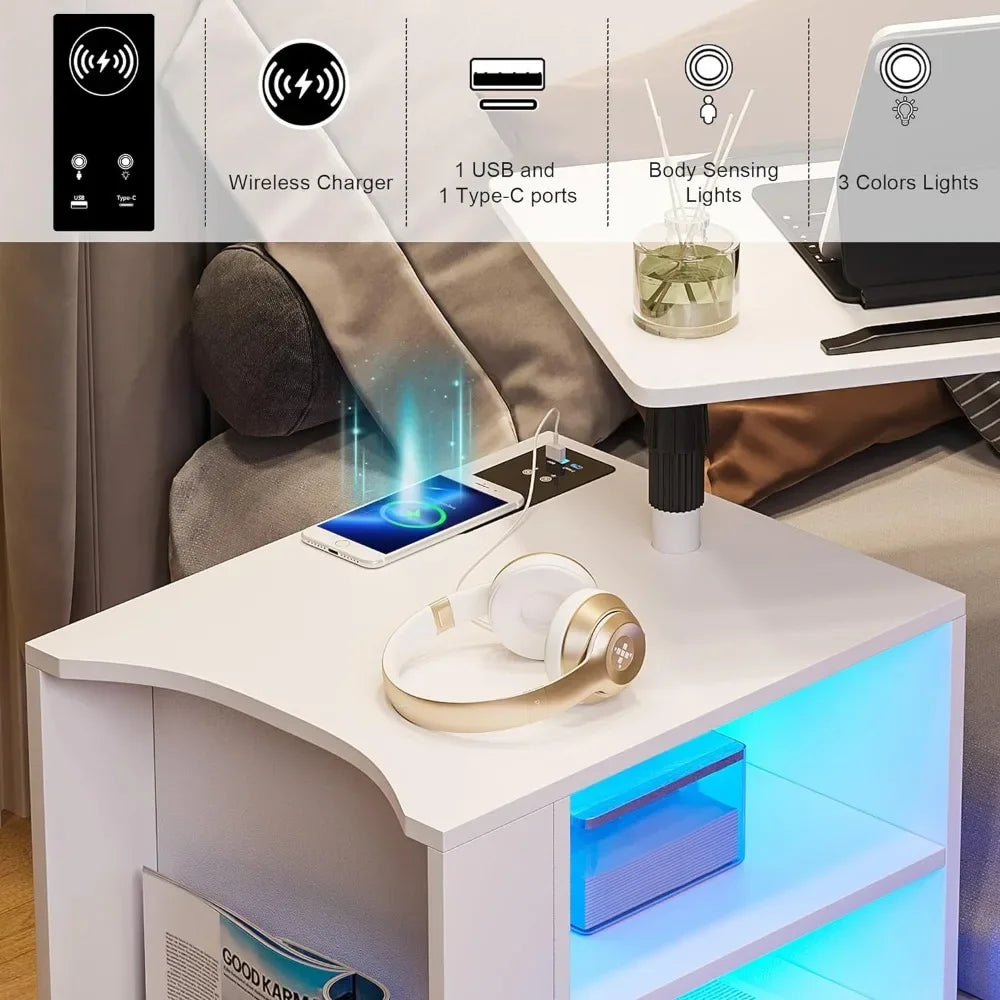 LED Nightstand: White with Wireless Charging, Adjustable Rotary Table