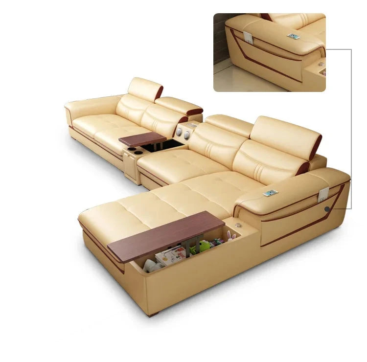 Genuine Cow Leather L-Shape Sofa Set - Bluetooth & Puff Seating