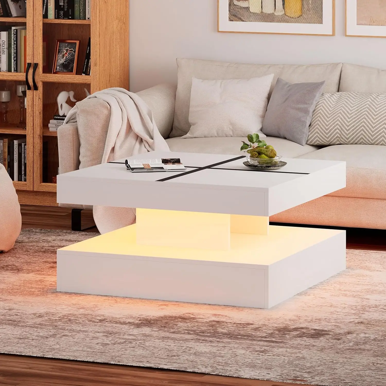 White and Black LED Coffee Table: Modern, Smart, Tall Square, 2-Tier Display Shelf, with Storage