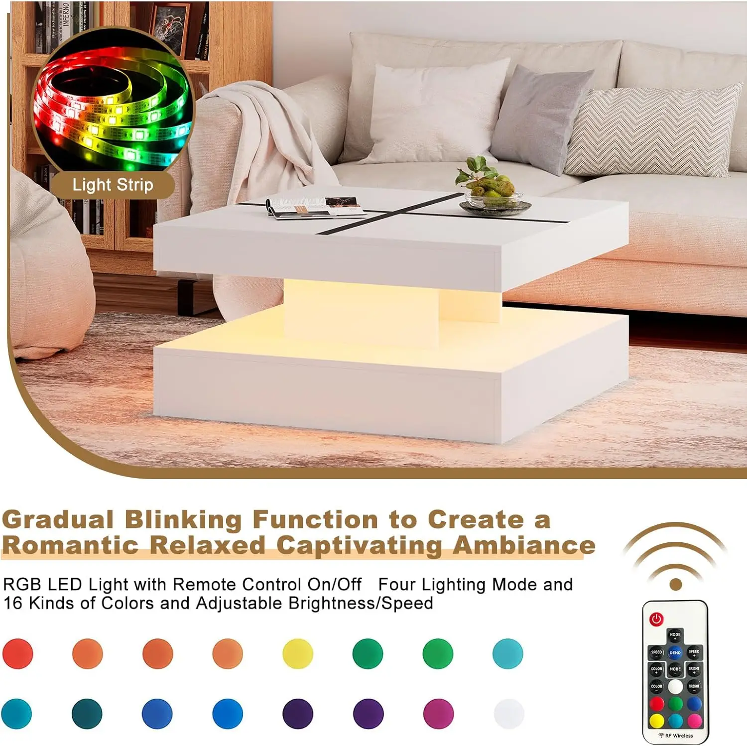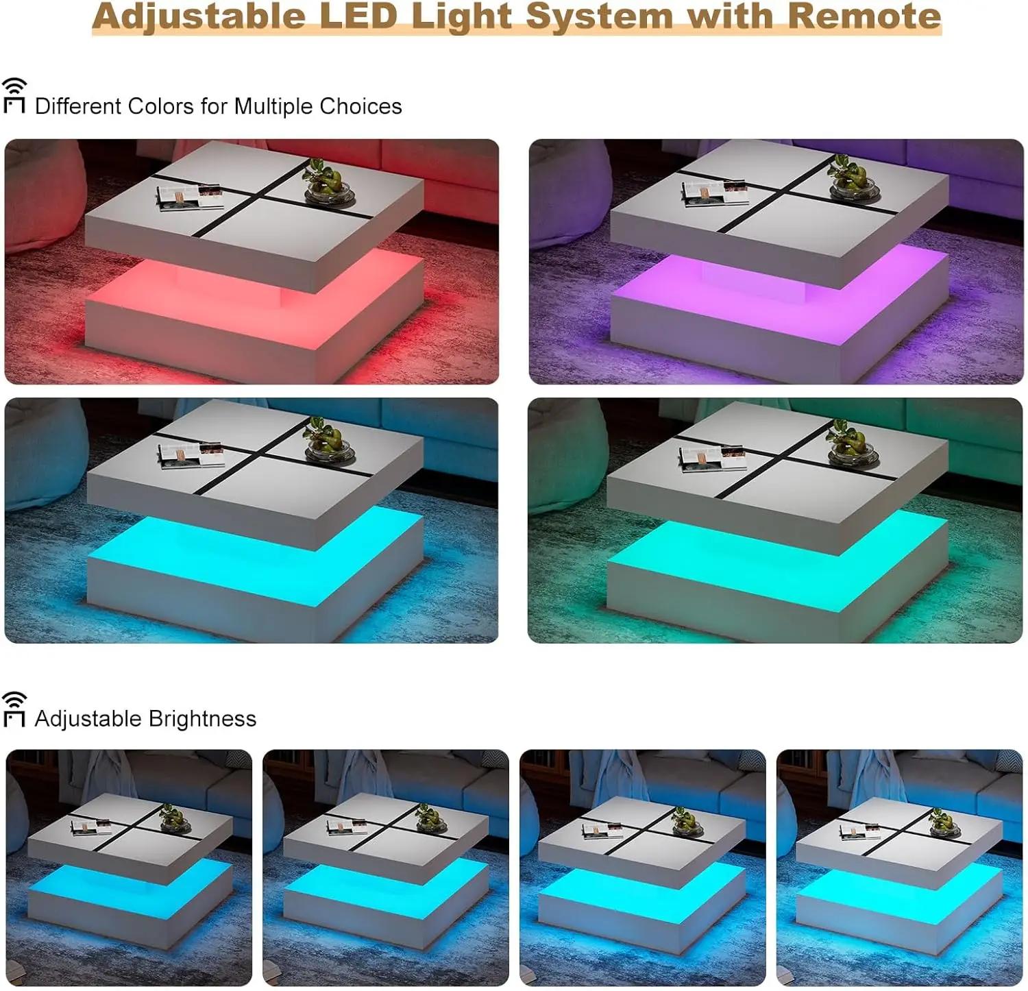 Functional and Stylish: Combining modern design with practical features, the White Black LED Coffee Table offers both style and functionality. Enjoy the benefits of customizable lighting, ample storage, and a chic design in one elegant piece.