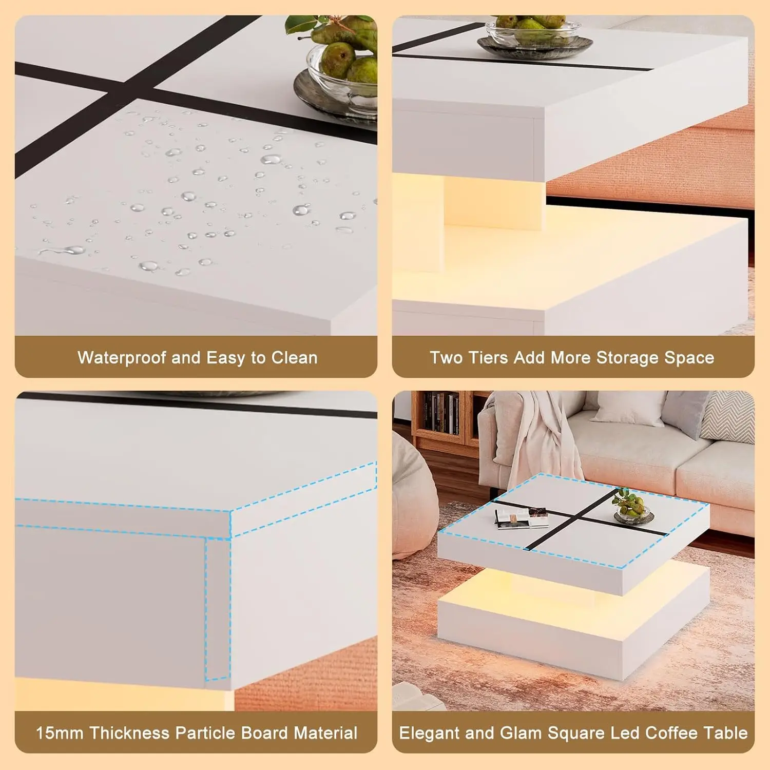 Transform your living room with the White Black LED Coffee Table, a modern and functional piece designed to make a statement. Featuring a sleek, two-tone finish, integrated LED lighting, and practical storage options, this tall square center table is both stylish and versatile.