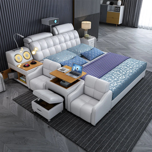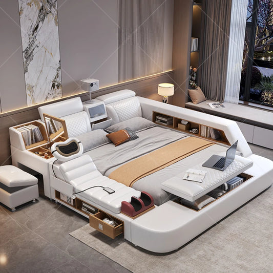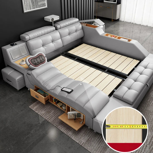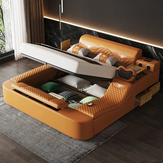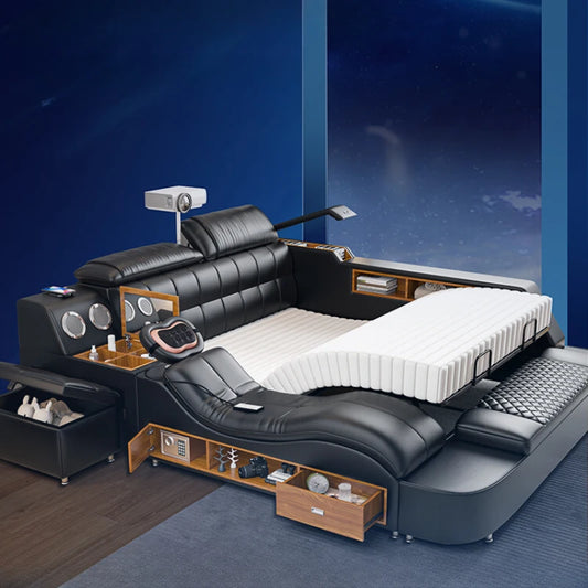 Genuine Leather Multifunctional Bed - Massage, Bluetooth, Safe