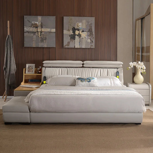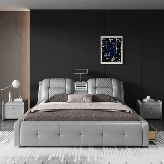 Luxury Queen Size Bed - Smart Tech, Genuine Leather, Multifunctional