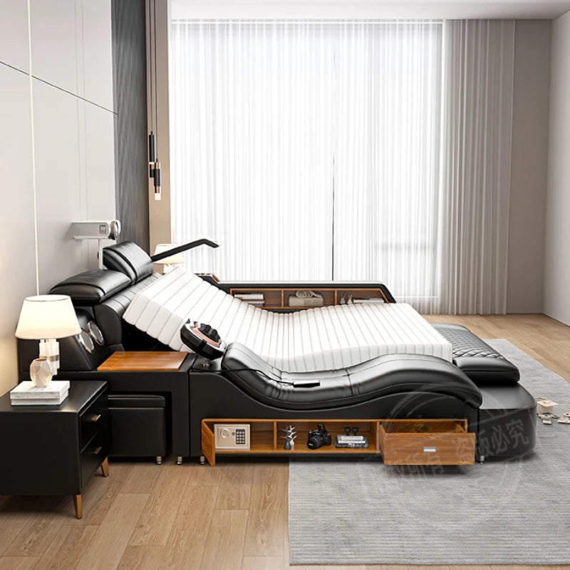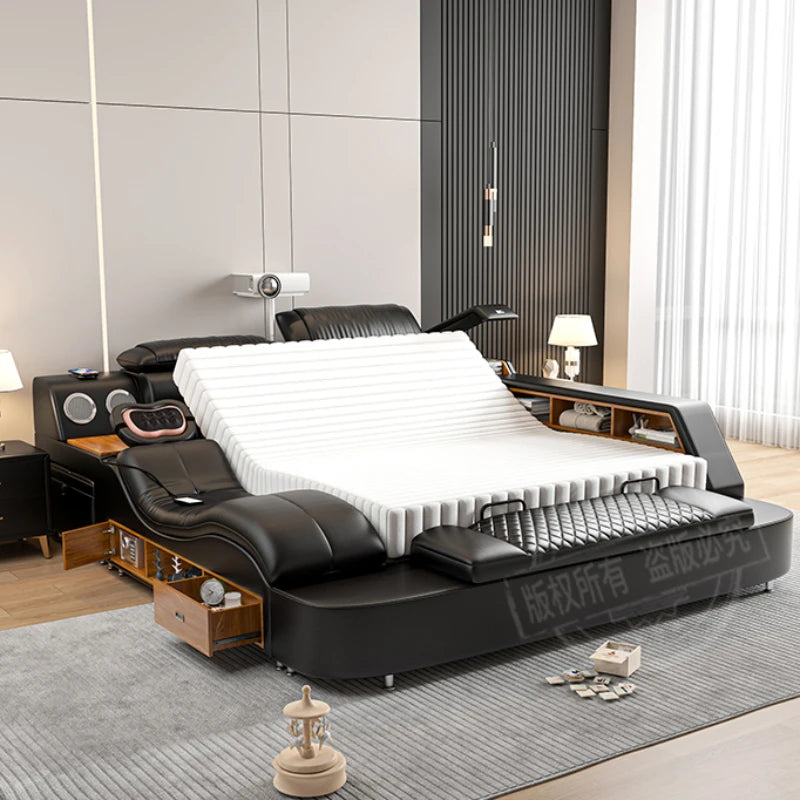 Genuine Leather Multifunctional Bed - Massage, Bluetooth, Projector