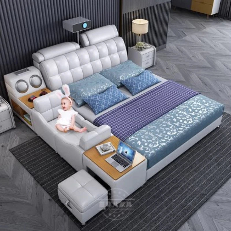 Enhance your bedroom with the Luxury Headboard Smart Bed, featuring a king-size design and a Nordic-inspired frame that blends elegance with functionality. This multifunctional bed is crafted with premium materials and designed to offer both style and practicality.