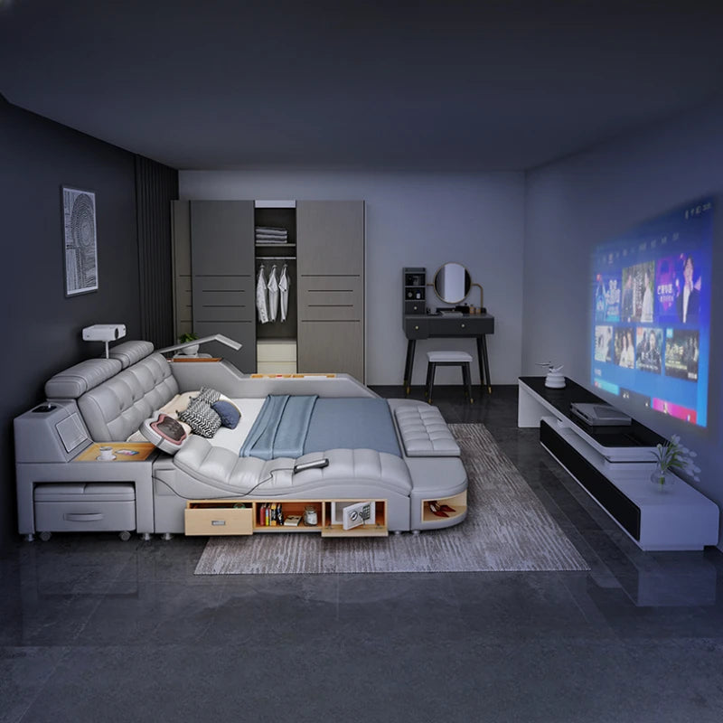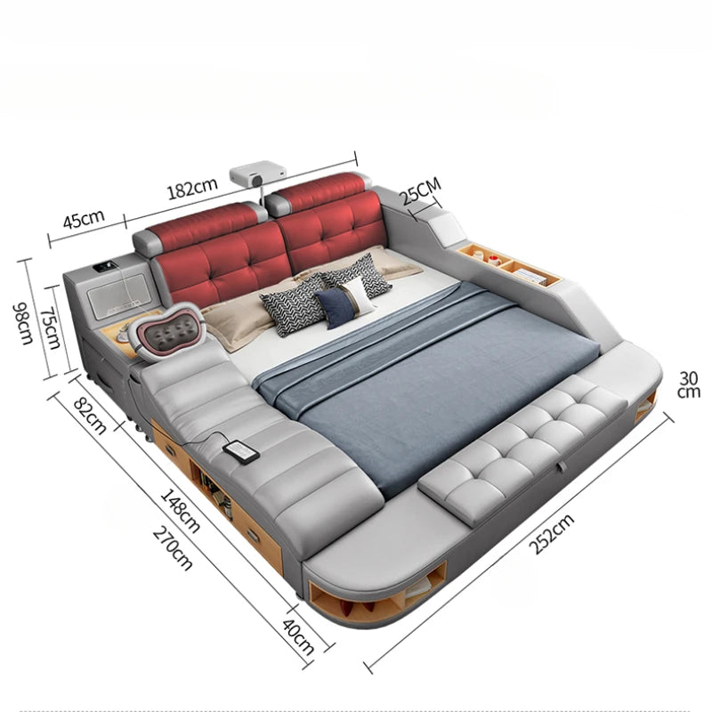 Luxury Queen Size Bed - Smart Tech, Genuine Leather, Multifunctional