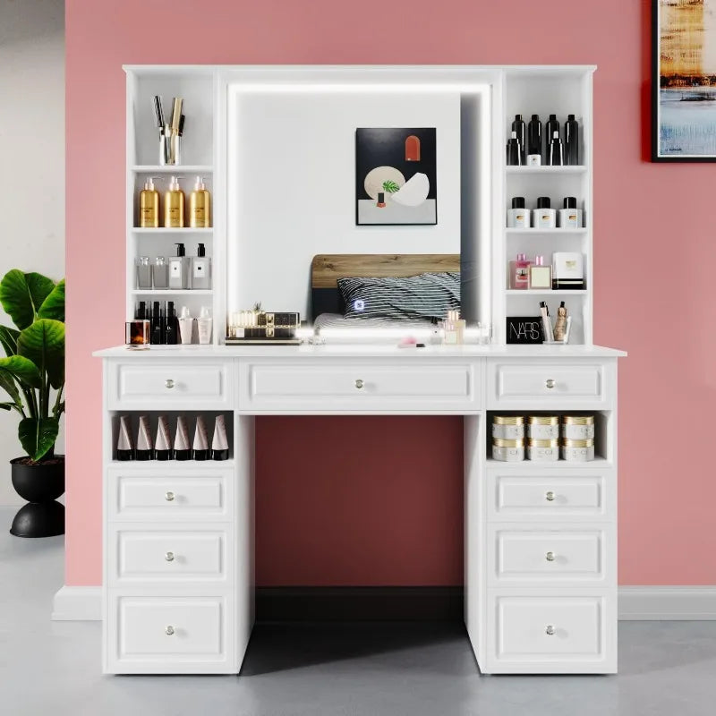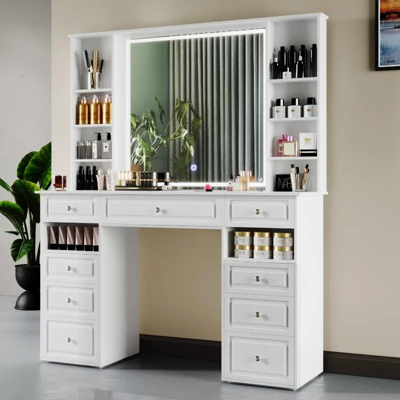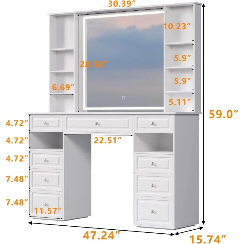 Extra Large Vanity Desk with Lighted Mirror & 9 Drawers, European Style