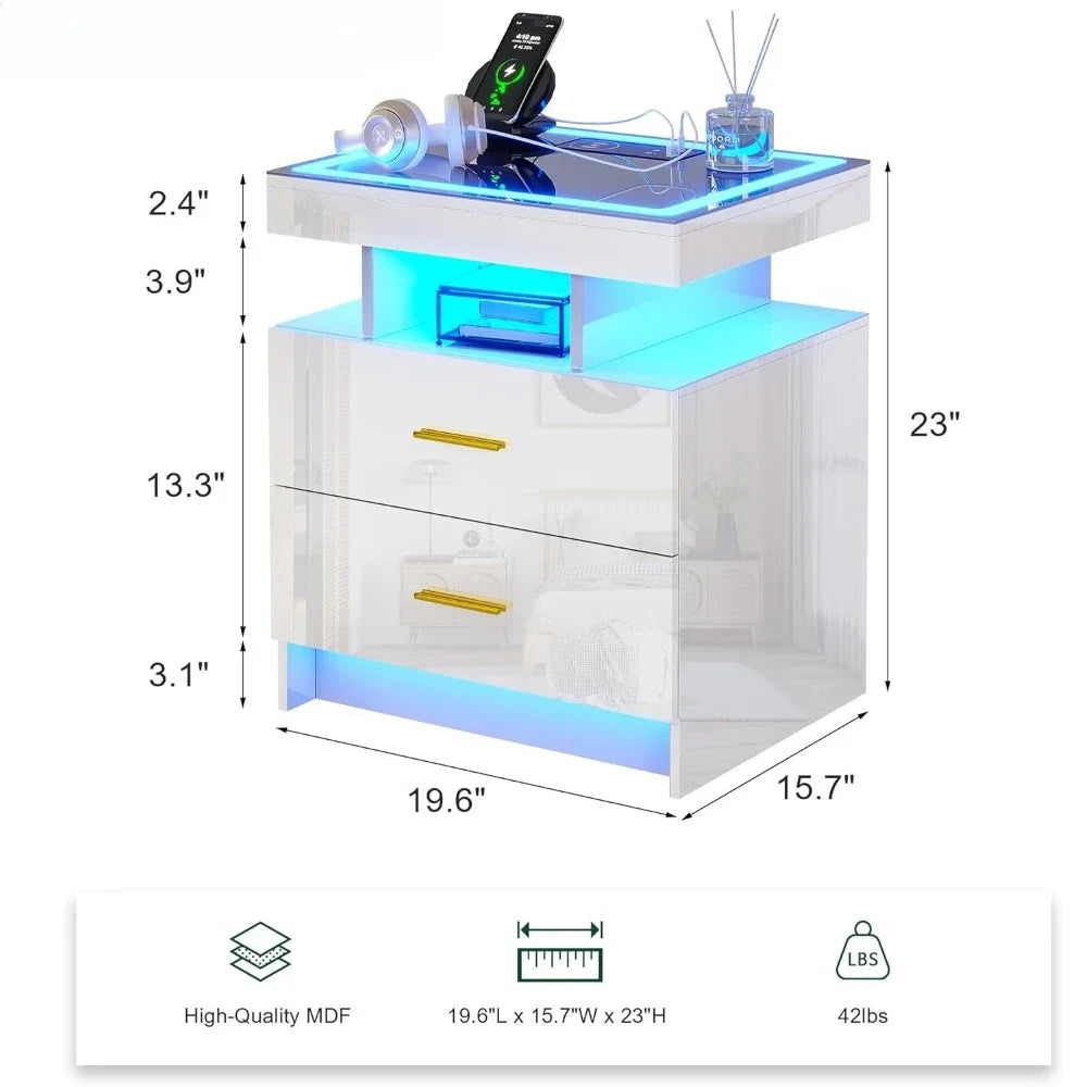 Upgrade your bedroom with these modern LED nightstands, featuring smart design and convenient functionality. Each nightstand comes equipped with two storage drawers, perfect for organizing your bedside essentials. The auto sensor lights automatically illuminate when motion is detected, providing gentle, ambient lighting without the need for manual switches. Additionally, the built-in charging station allows you to power your devices effortlessly, keeping your space clutter-free.