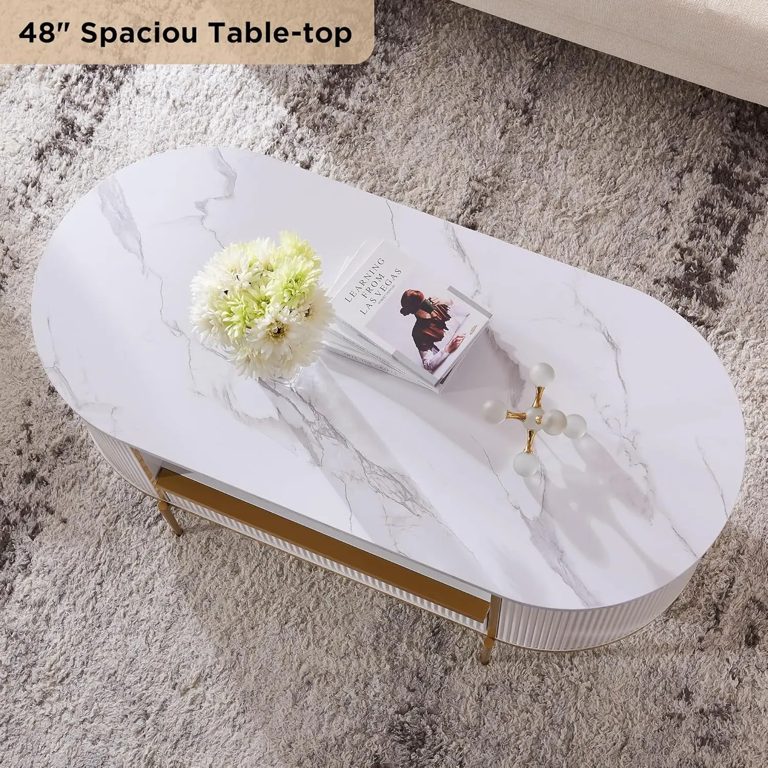 Elevate your living space with the Modern Luxury Fluted Coffee Table, a stunning blend of elegance and functionality. This 48" oval coffee table, featuring a natural oak finish and gold metal accents, is designed to be the centerpiece of your living room, combining sophisticated design with practical features.