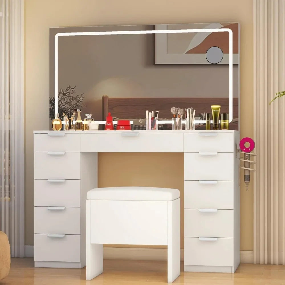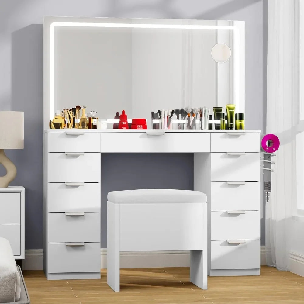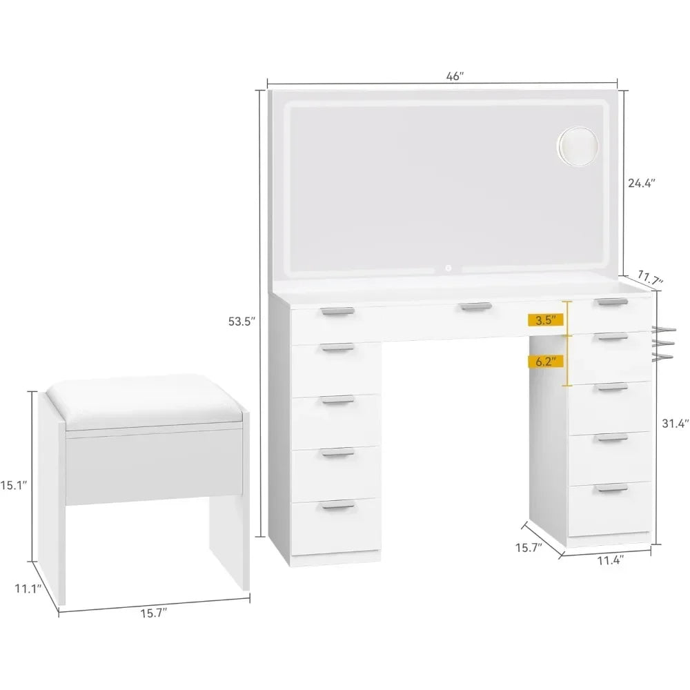 Vanity Desk Set with LED Lighted Mirror, Power Outlet, 11 Drawers, Magnifying Glass & Storage Bench
