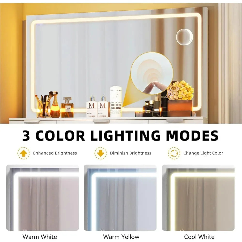 Transform your beauty space with this elegant vanity desk set, designed to offer both style and comprehensive functionality. The set features an LED lighted mirror with adjustable illumination, providing perfect lighting for makeup application. An integrated power outlet allows for convenient charging of your electronics and beauty tools.